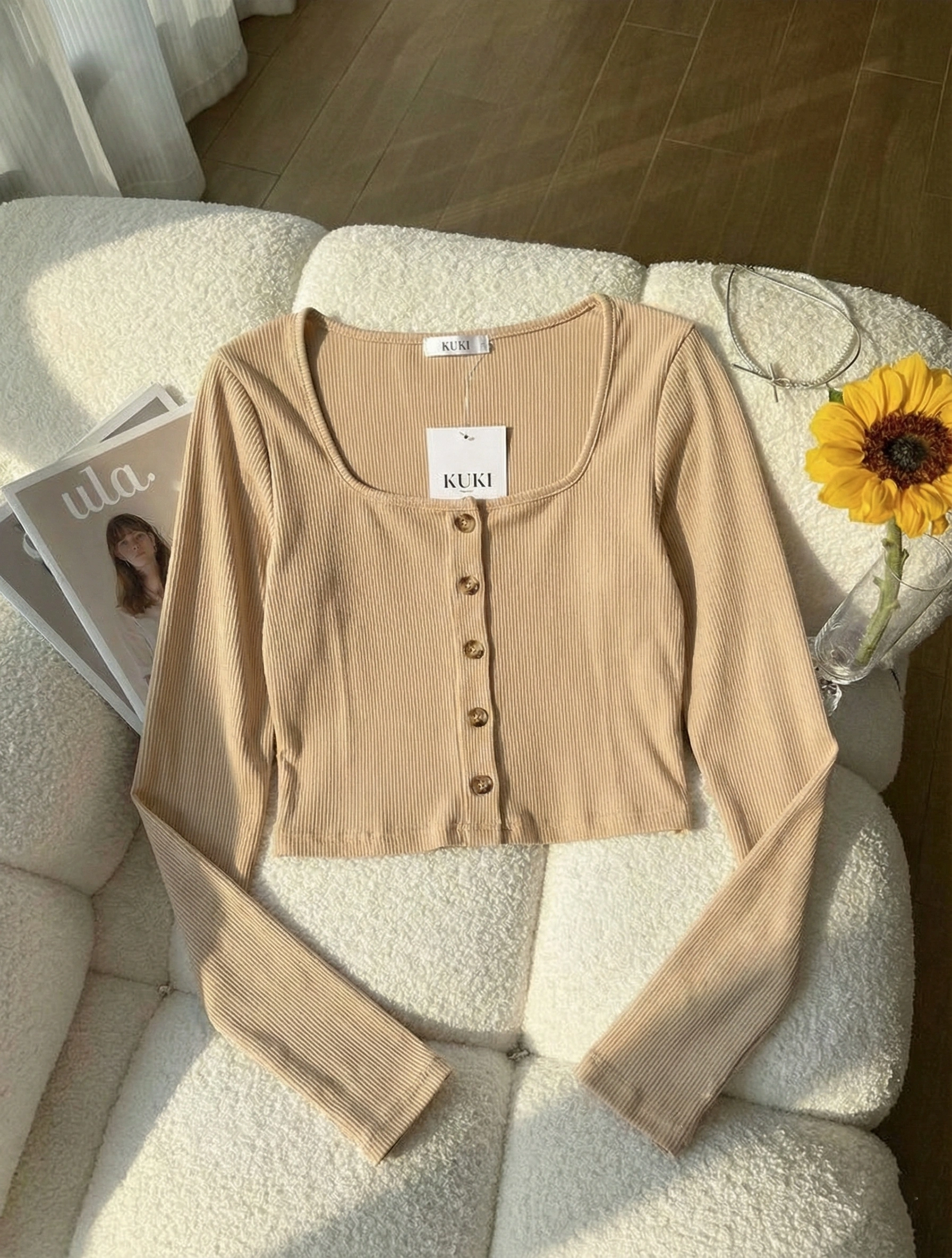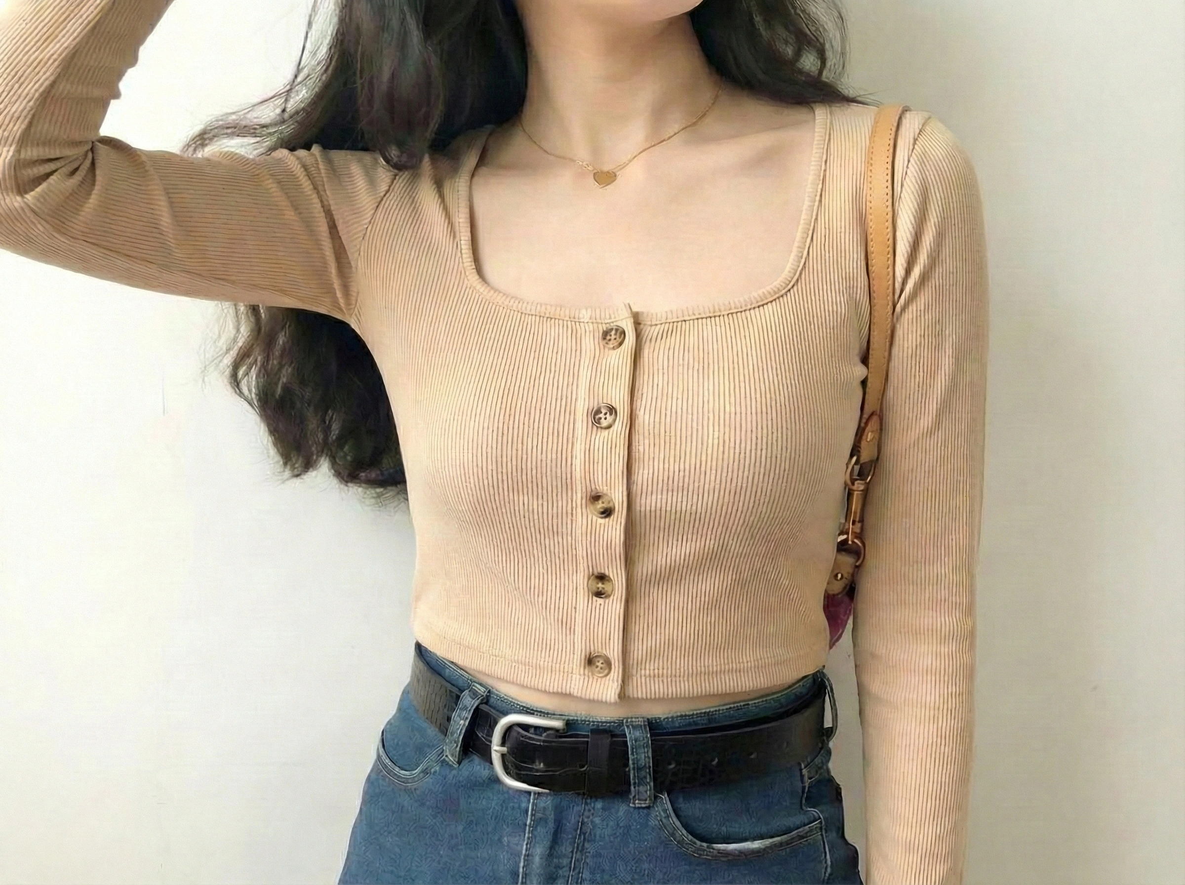 Beige Ribbed Button Crop TopBeige Ribbed Button Crop Top