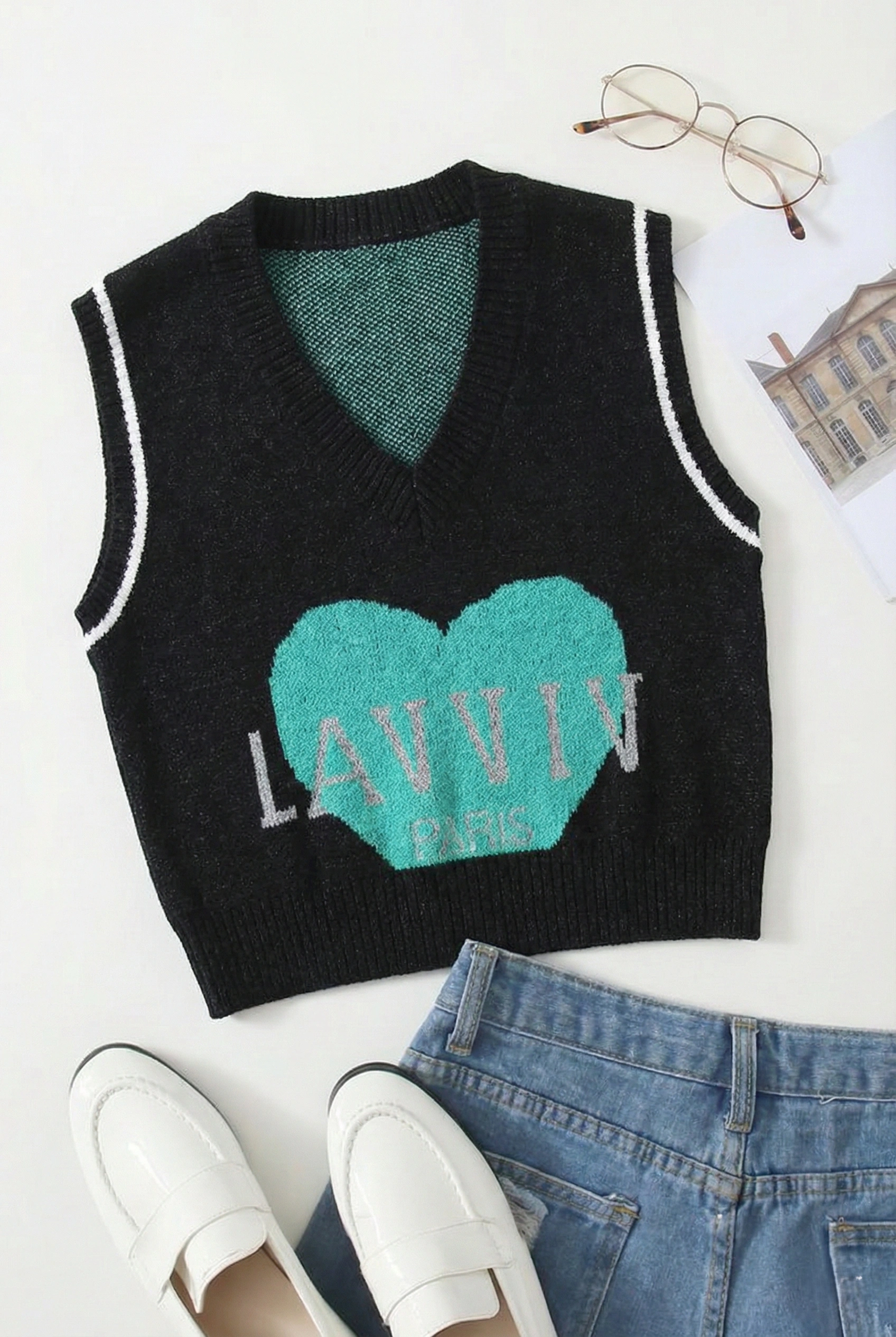 - Soft knitted fabric with bold heart graphic