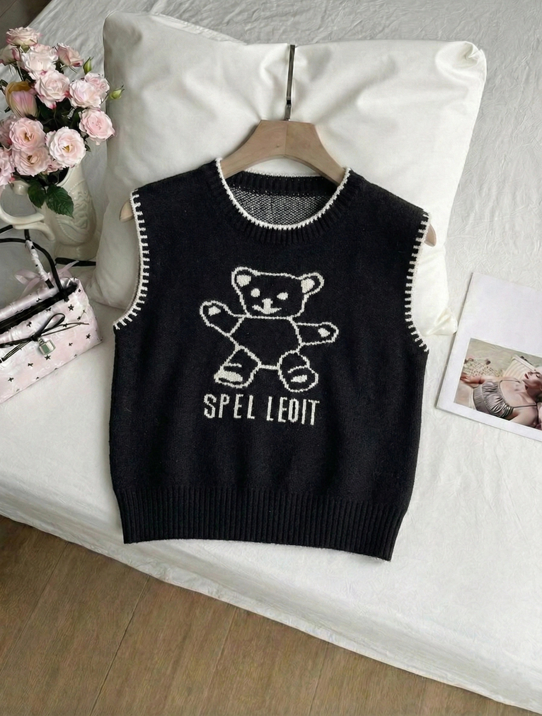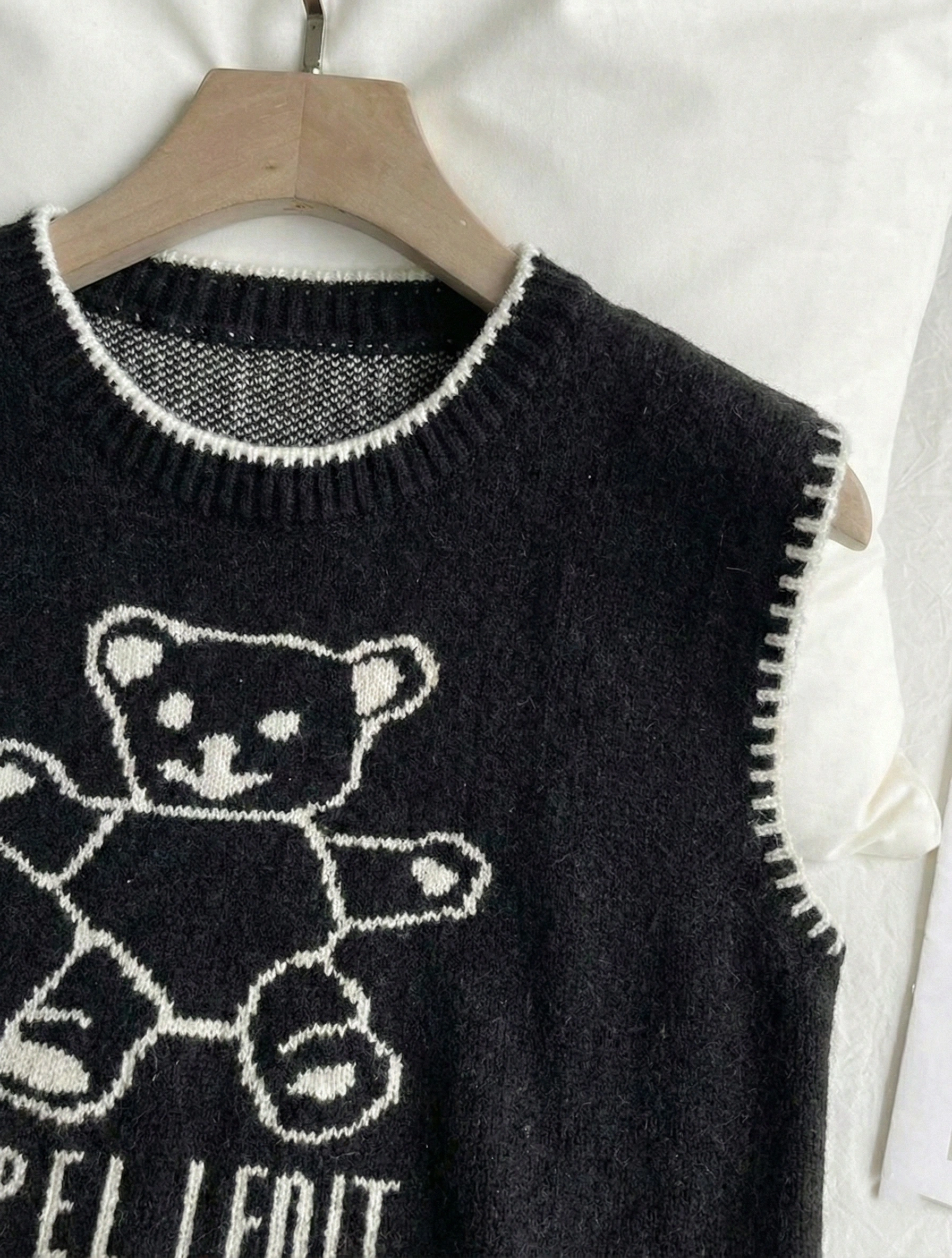 Cozy black knit sweater vest featuring a playful teddy motif for a cute, casual winter look.
