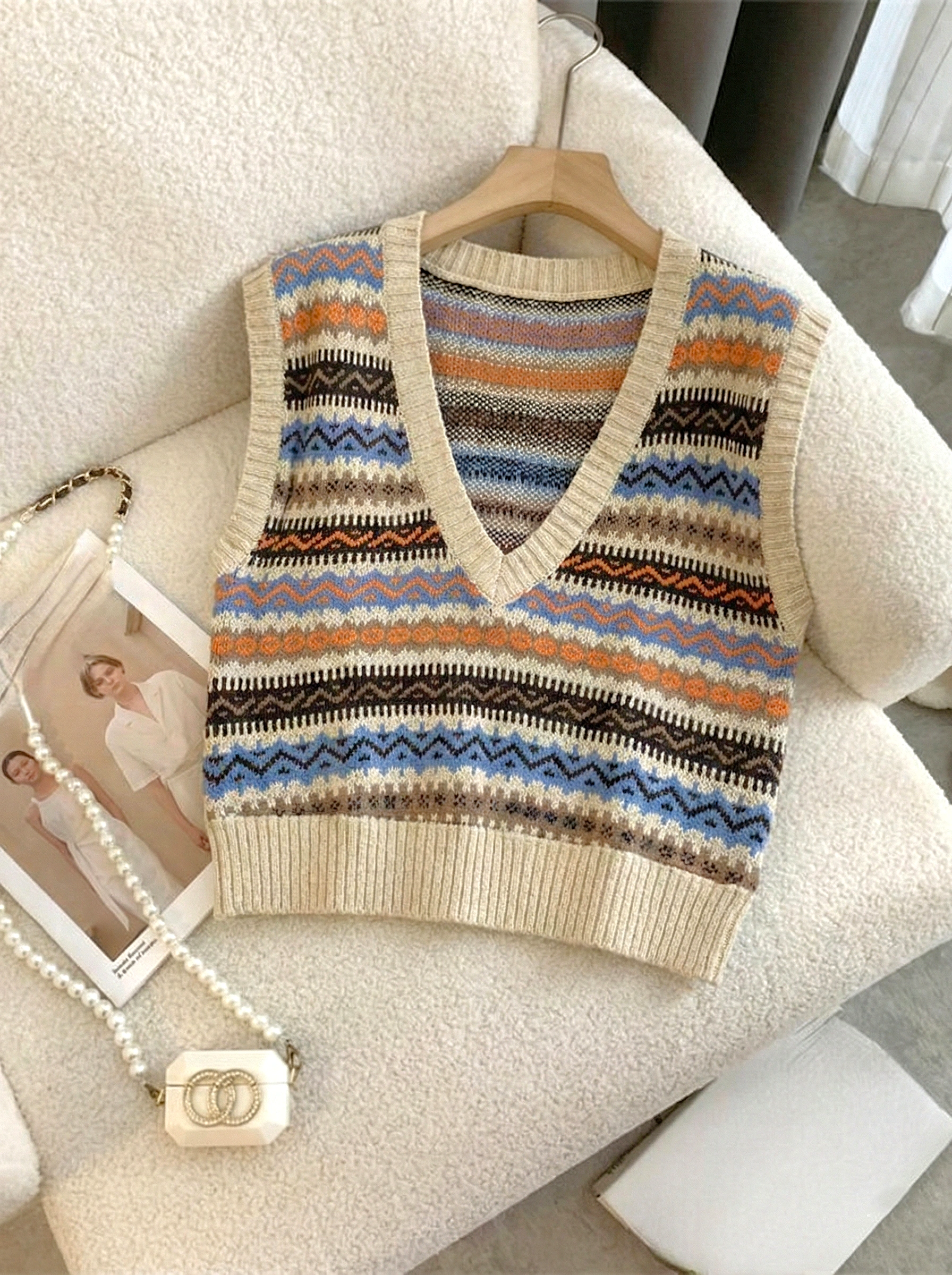 Vintage-inspired Fair Isle sweater vest with rich multicolor stripes for a cozy, statement layering look.