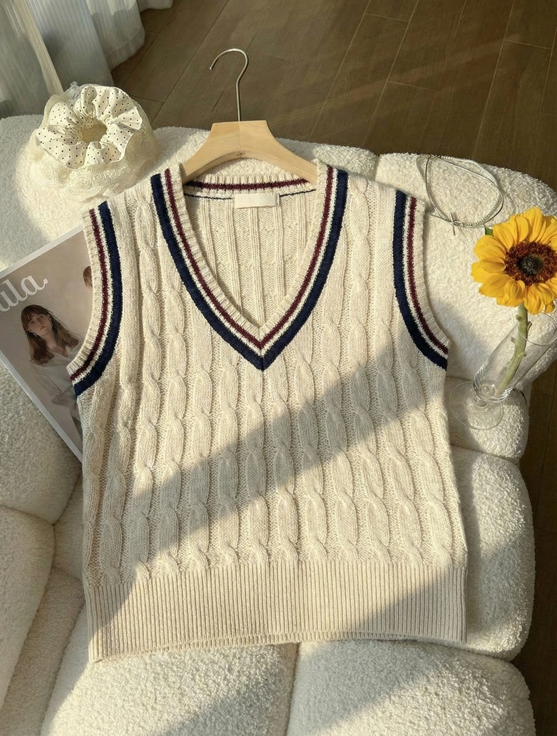 Cream cable-knit sweater vest with contrast stripe V-neck for a classic preppy style.