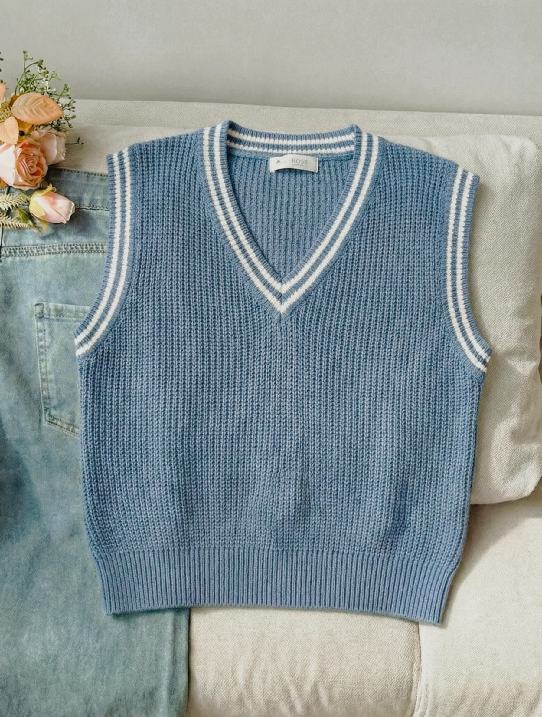 Minimal ribbed sweater vest with contrast stripe V-neck for a clean, everyday layering style.