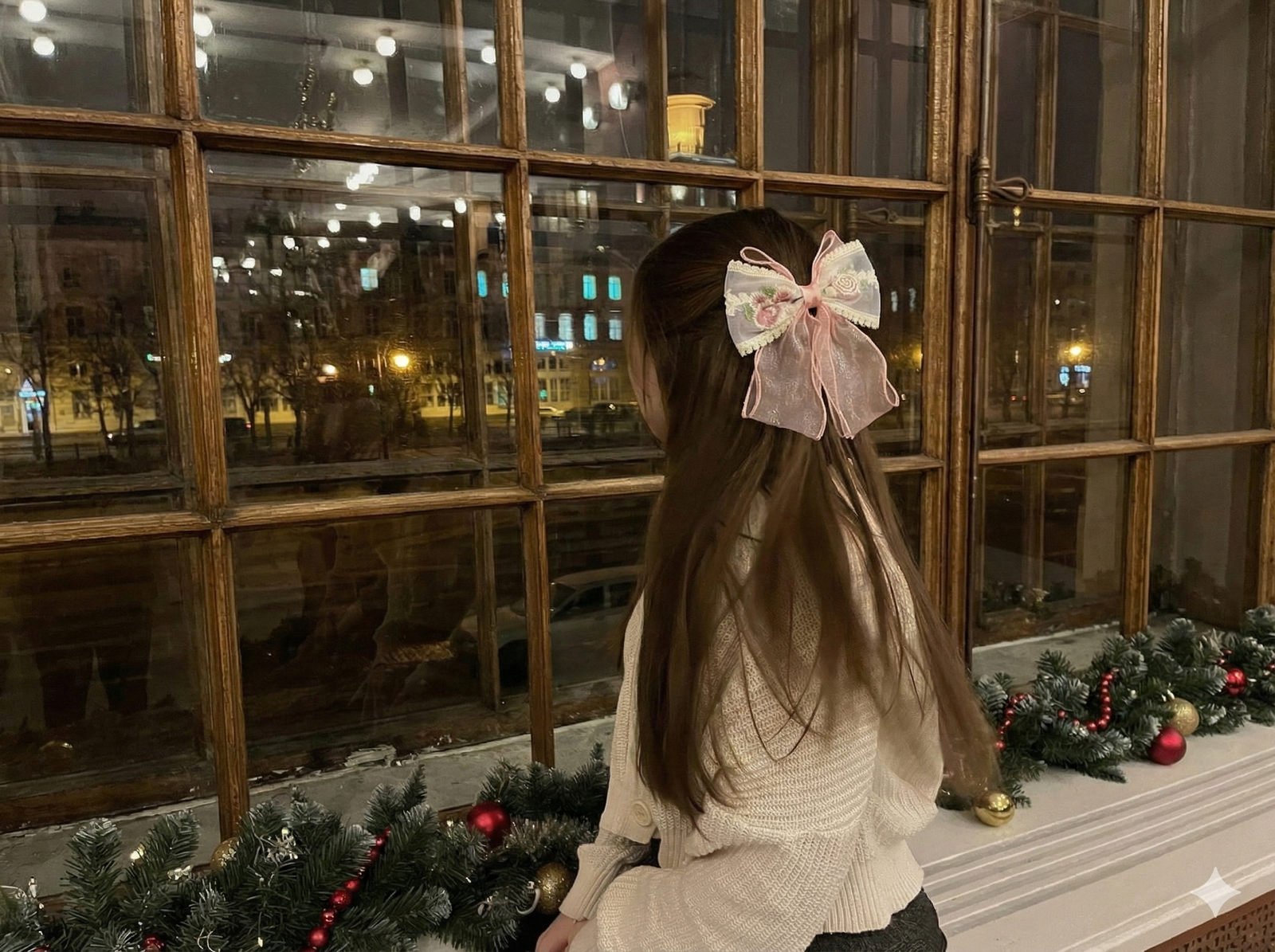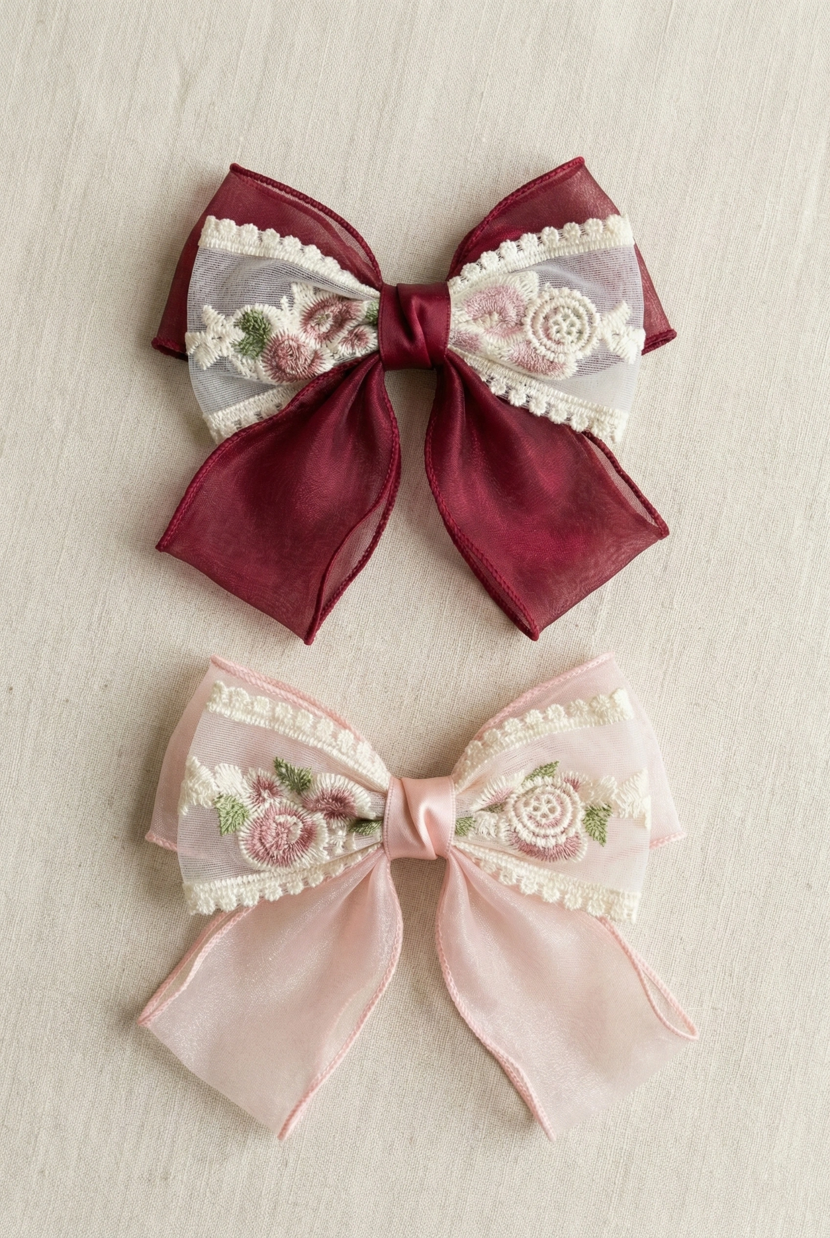 - Sheer organza bow with floral embroidery